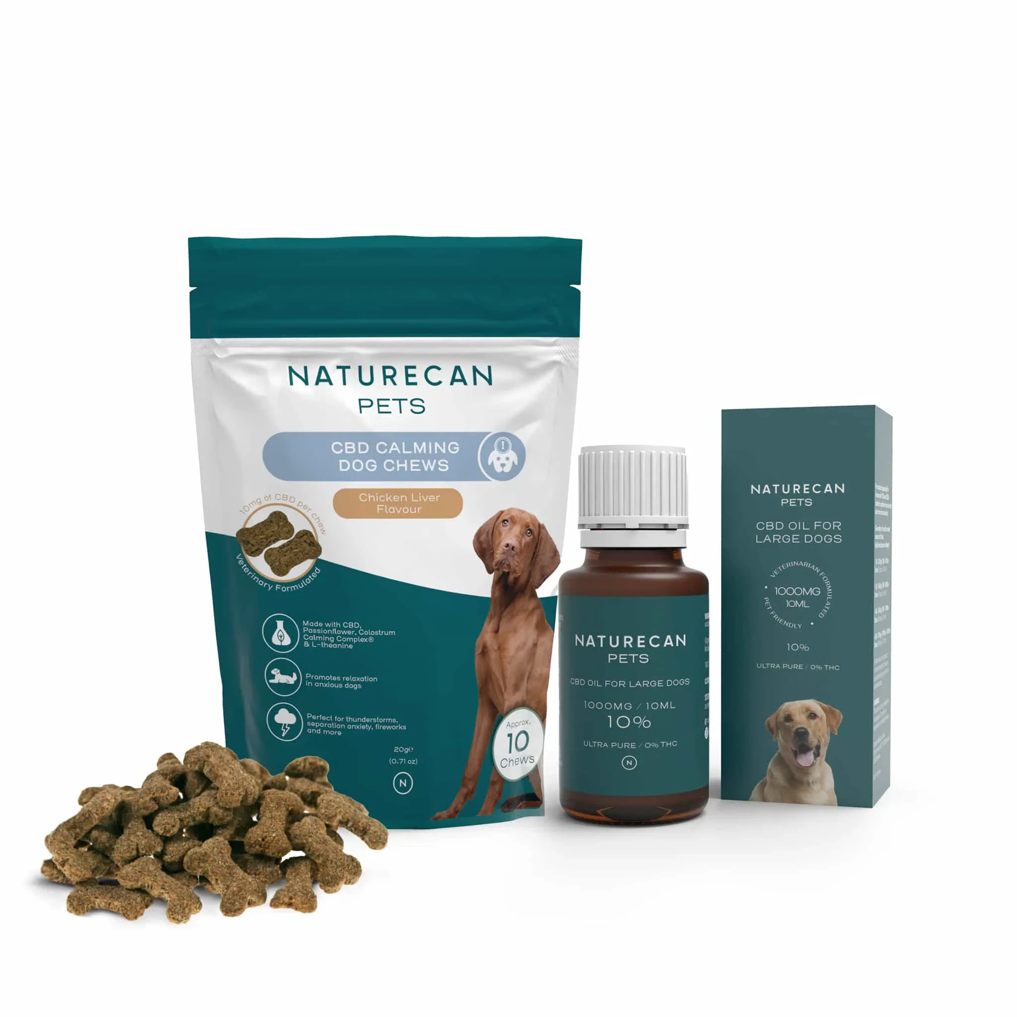 Includes our CBD oil for dogs and CBD calming dog treats. Save when you buy together, and save even more when you buy the 30ml bottle!Â